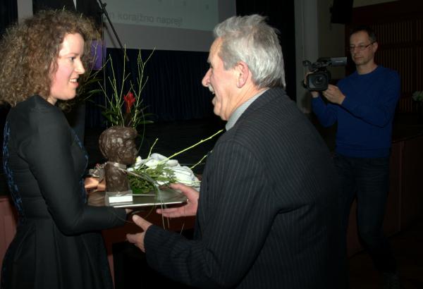Janezu Kosmaču, predsedniku društva, podeljuje Uršula Jašovec posebno priznanje Krajevne skupnosti Radomlje za dolgoletno kulturno dejavnost, ki prispeva k povezovanju in prostovoljni dejavnosti vaščanov