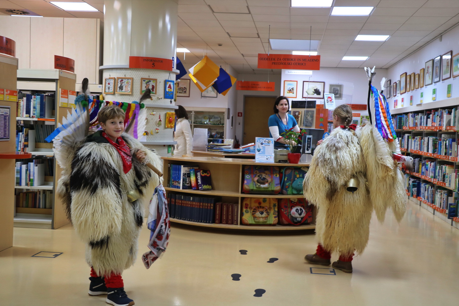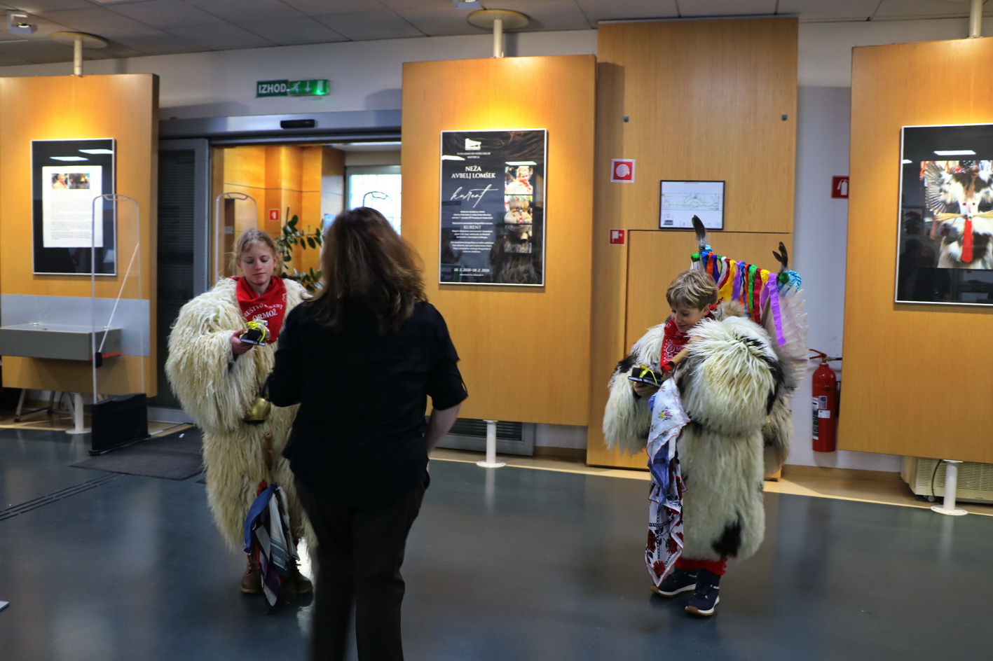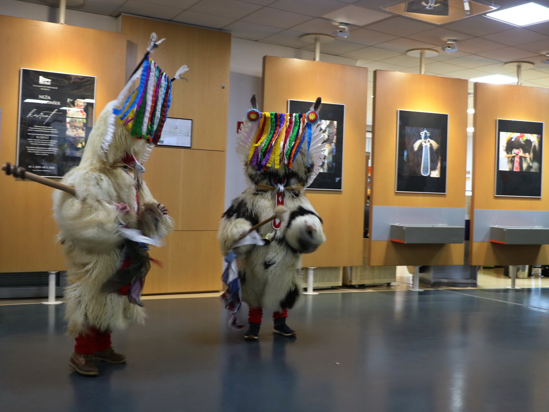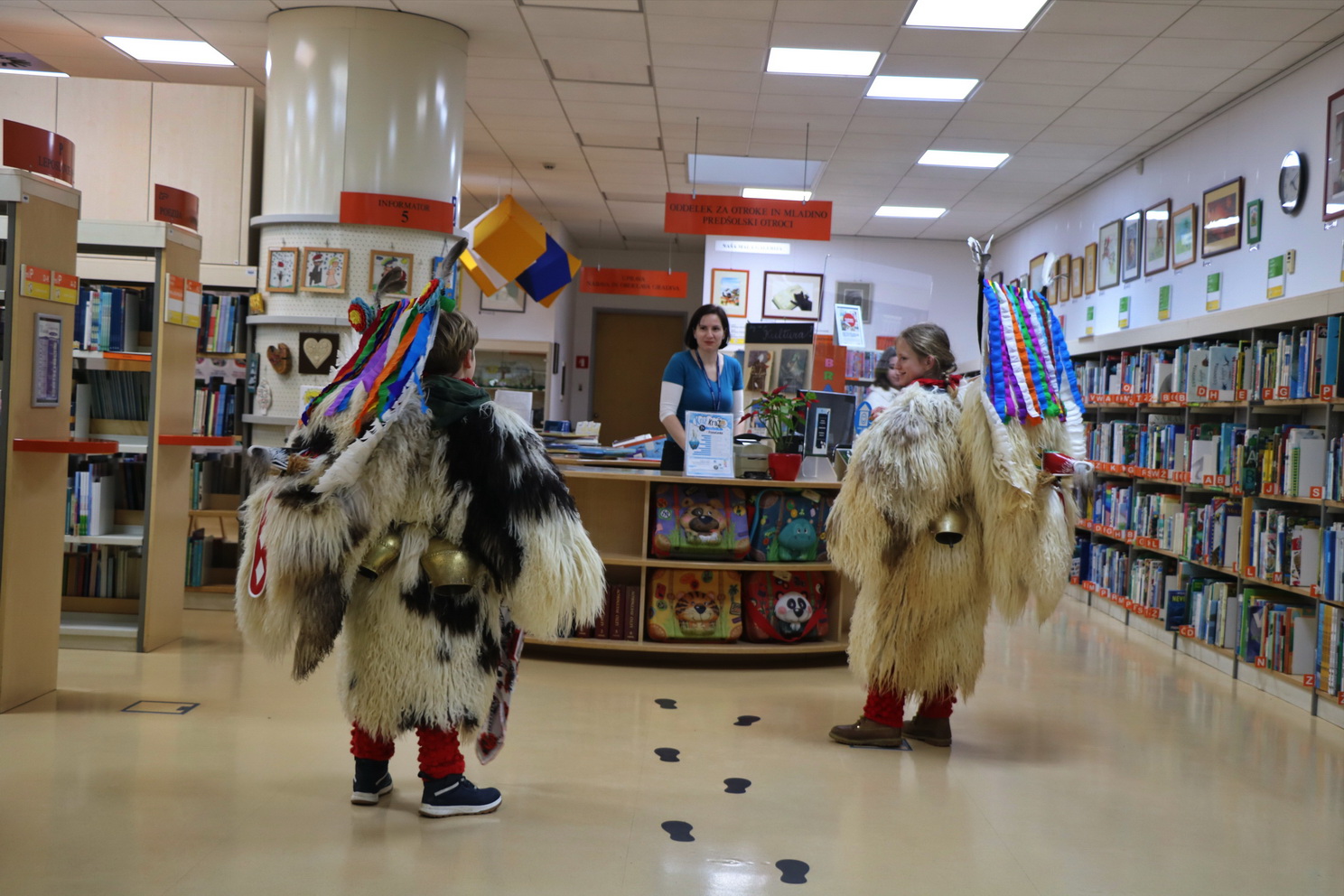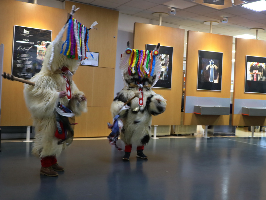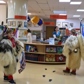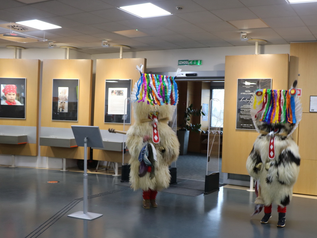 Deževno popoldne ni ustavilo dveh kurentov, podala sta se v Knjižnico Domžale na ogled Nežine fotografske razstave Kurent. Knjižnica je sicer prostor, kjer je tišina doma, a danes popoldne so zvonili veliki kurentovi zvonci po prostoru knjižnice in nihče se ni jezil. Vsi so jih bili zelo veseli.
