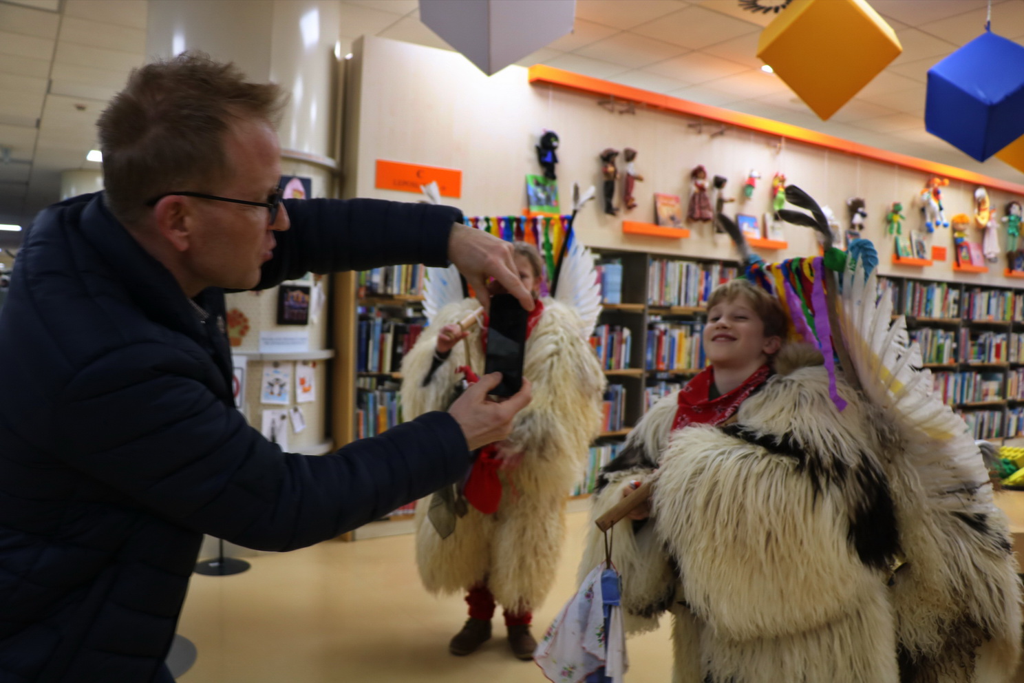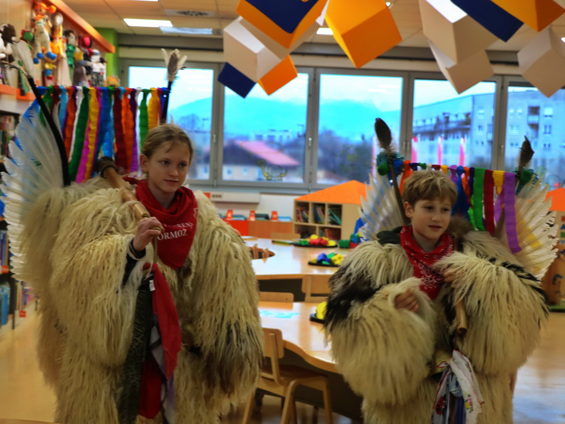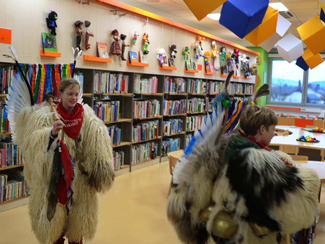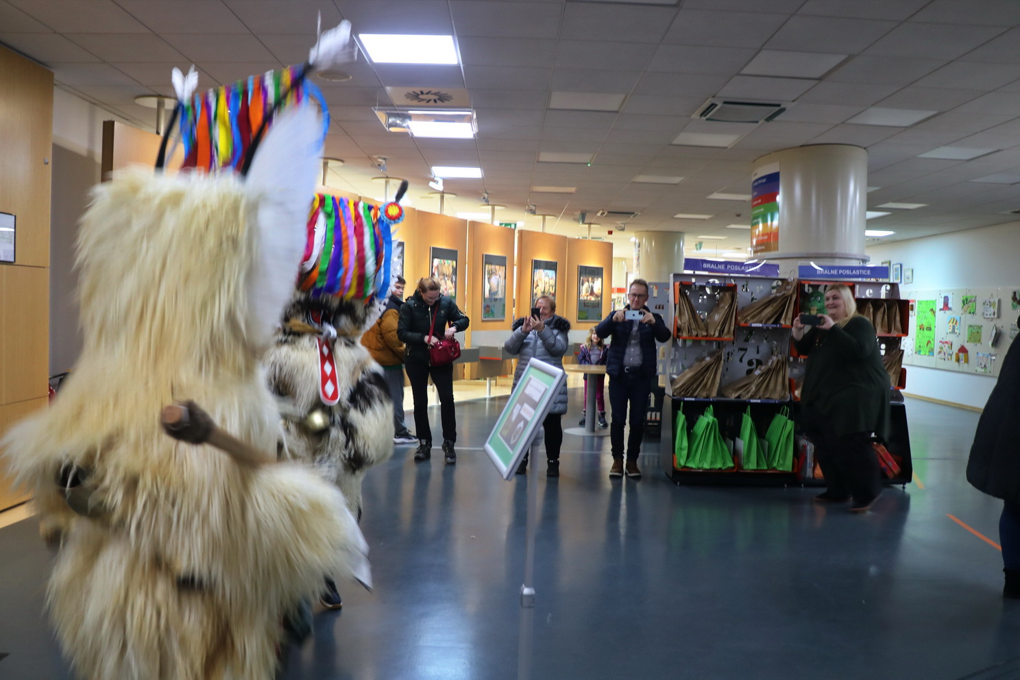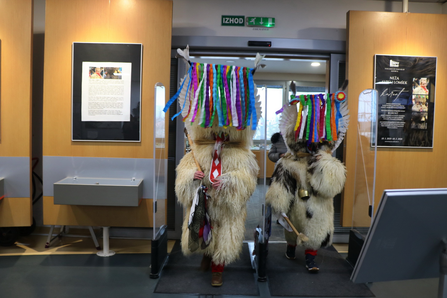 Deževno popoldne ni ustavilo dveh kurentov, podala sta se v Knjižnico Domžale na ogled Nežine fotografske razstave Kurent. Knjižnica je sicer prostor, kjer je tišina doma, a danes popoldne so zvonili veliki kurentovi zvonci po prostoru knjižnice in nihče se ni jezil. Vsi so jih bili zelo veseli.